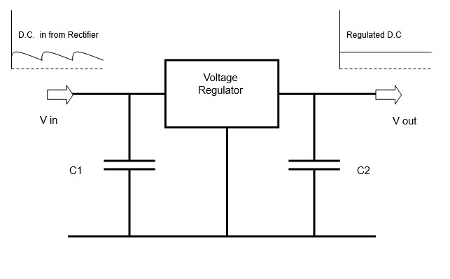 Pulsed d.c. comes to the IC regulator input which also has C1 as a smoothing capacitor. The use of the IC regulator also steps down the voltage, but has a real effect of smoothing the d.c. output to near a pure level of voltage. Capacitor C2 has a stabilising effect on the way the IC regulator works. Typical use for home constructors are the 78XX series of regulators. e.g. a 7805 would give a 5V stable output or a 7812 would give a 12V output. They can also be used with pass transistors to pass higher currents.